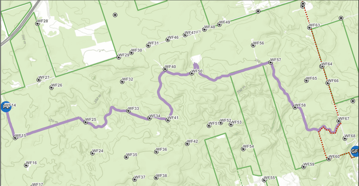 - Please follow the route P2, WF15, WF25, WF33, WF34, WF41, WF40, WF50, WF57, WF58, to WF67, follow Fire Route 101 to the Ganaraska Forest Centre (or do this in the reverse). Please use the Ganaraska Forest Map on their website or download the app Field Map and download the Ganaraska Forest Map.